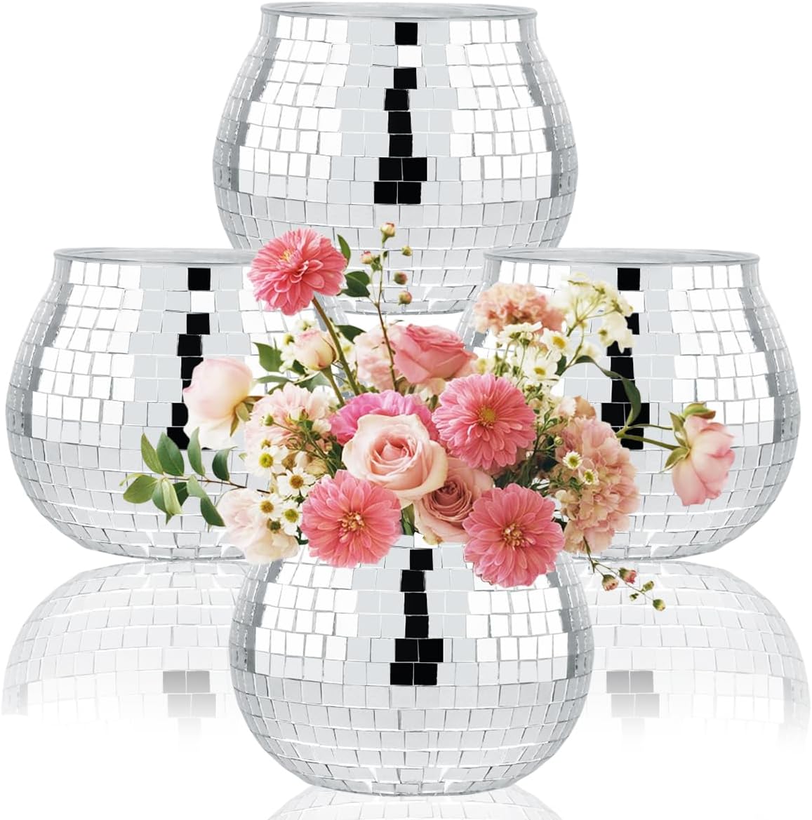 Name:4 PCS Disco Ball Vase & Candle Holder, 4x4.7inches Mirrored Disco Ball Planter - Perfect Decoration for Living Room, Bedroom, Dining Table, Wedding, Party, Birthday(4x4.7 Plastic)Material: PlasticQuantity: 4 pcsColor: as shownApplication: Ideal for weddings, birthdays, or parties, these disco ball vases for centerpieces seamlessly integrate into various occasions, adding a unique flair and enhancing the overall atmosphere of any event.Package contentdisco ball vase×4pcsAttentionGoods due to long time transportation, individual products may be defective, if you encounter defective products, please contact us in a timely manner to replace!As the above dimensions are measured manually, the size of the actual item you receive may be slightly different from the above dimensions.Due to monitor, camera or other factors, there may be a slight color difference