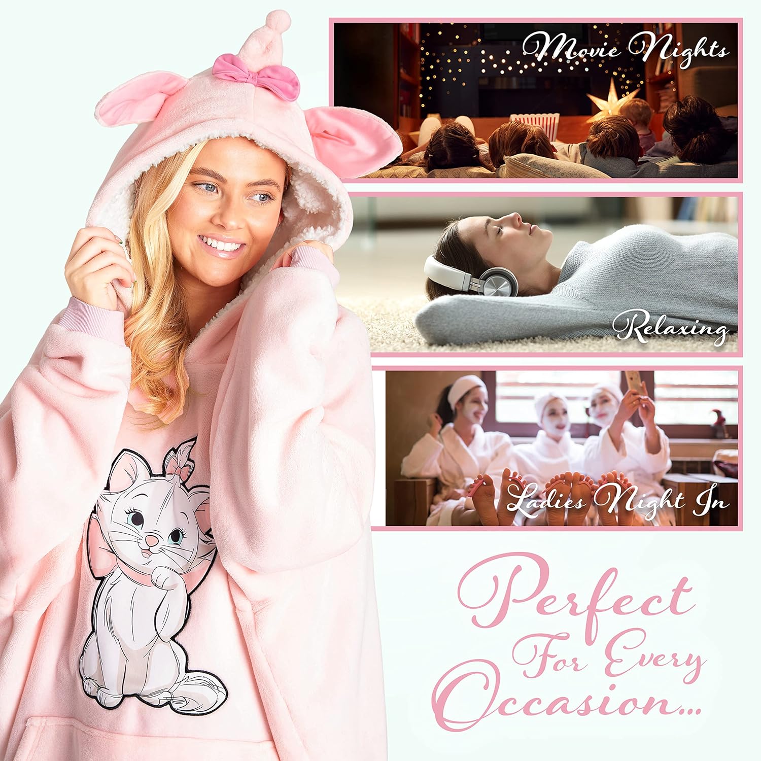 Disney oversized hoodie blanket for women and teens Treat yourself to comfort like never before and up in this soft fleece blanket hoodie, featuring a range of favourite Disney characters, including; Marie, Mickey Mouse, Minnie Mouse and more! Stay warm and save on electricity bills this winter. This oversized hoodie blanket is made with super-soft fleece and features a sherpa-lined hood for extra cosiness, designed to keep the heat in. There’s even a roomy kangaroo pocket to keep your hands warm Upgrade your comfort, this hoodie makes the perfect work-from-home uniform, or is ideal for relaxing or watching movies Looking for womens gifts? These hooded blankets make a great Disney gift for someone special